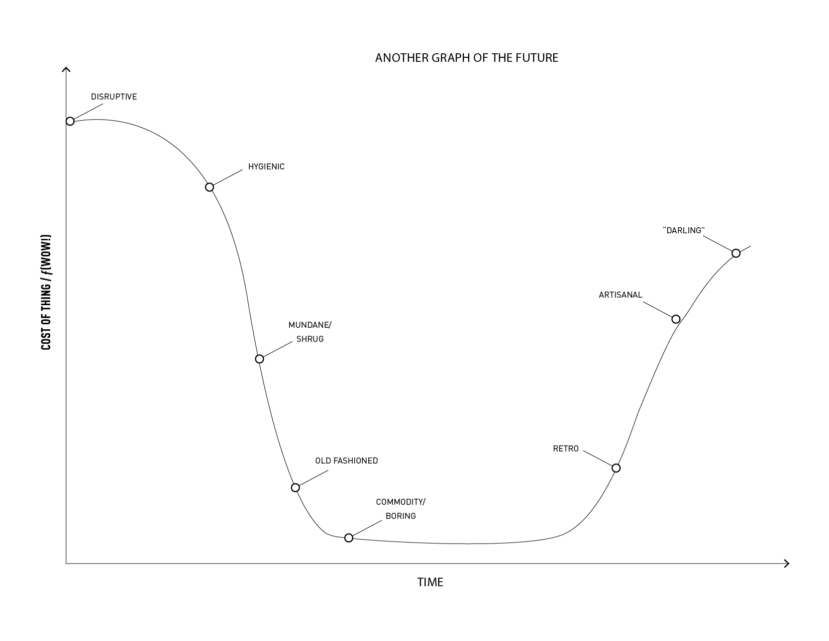 fig. h: A useful projective graph that traces a disruptive idea straight down through common/everyday/ordinary and eventually to old-fashioned/quaint. An extremely small minority of things experience a second life as retro, artisanal and even ‘darling’ revivals. For example, film cameras, regional lagers, external frame backpacks, calculator watches, luggage without wheels.