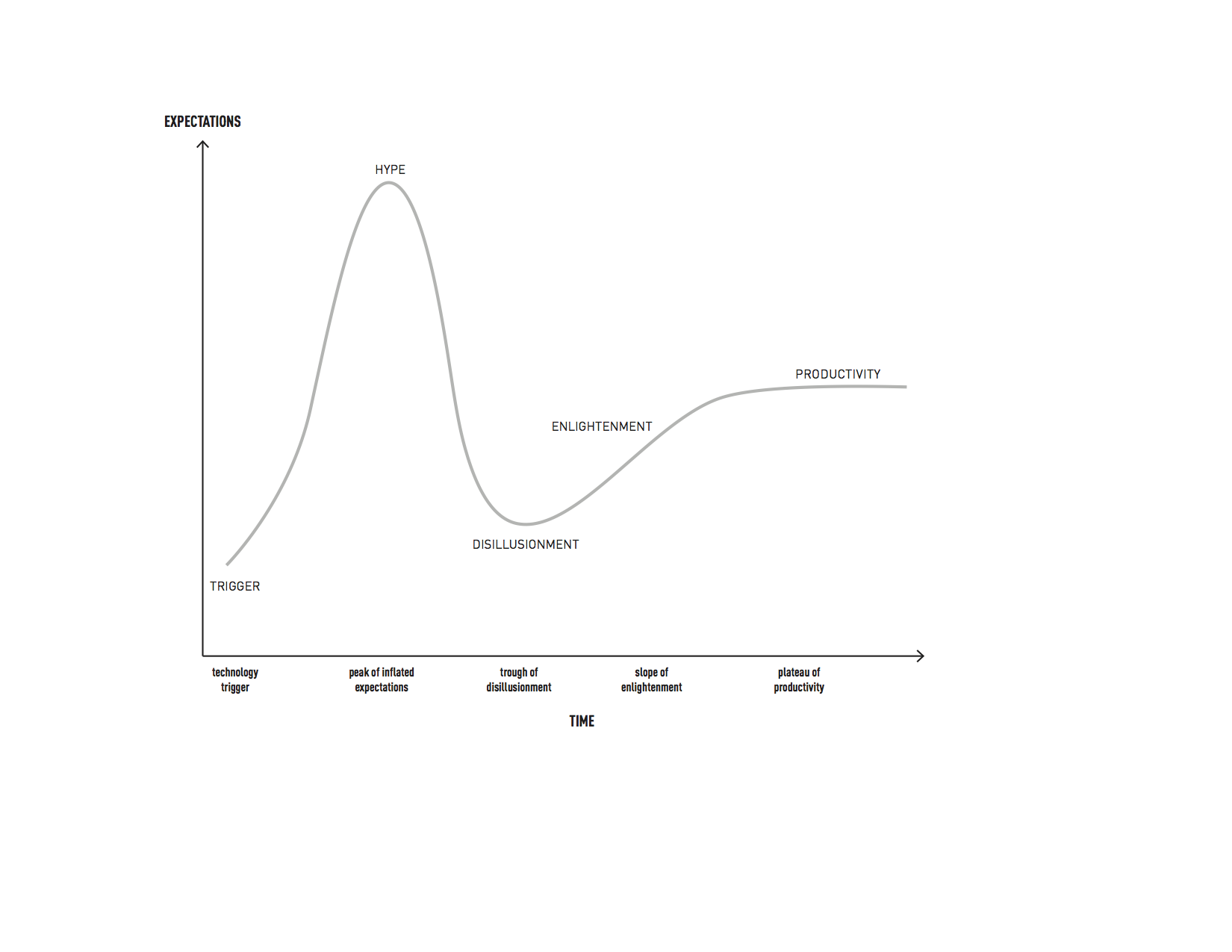 fig. a: Gartner Hype Curve traces outrageous ideas from excited trigger moments through frenetic hype (typical in media outlets) to inevitable sad disillusionment to refinement of what is actually sensible finally to mundane product/ion. Oftentimes  the principle is reflected differently at the trigger point and final possible-profitable-desireable productivity point. For example, personal autonomous transportation as a trigger principle as represented as personal jet pack and finally reflected in its viable form as on-demand autonomous vehicles.
