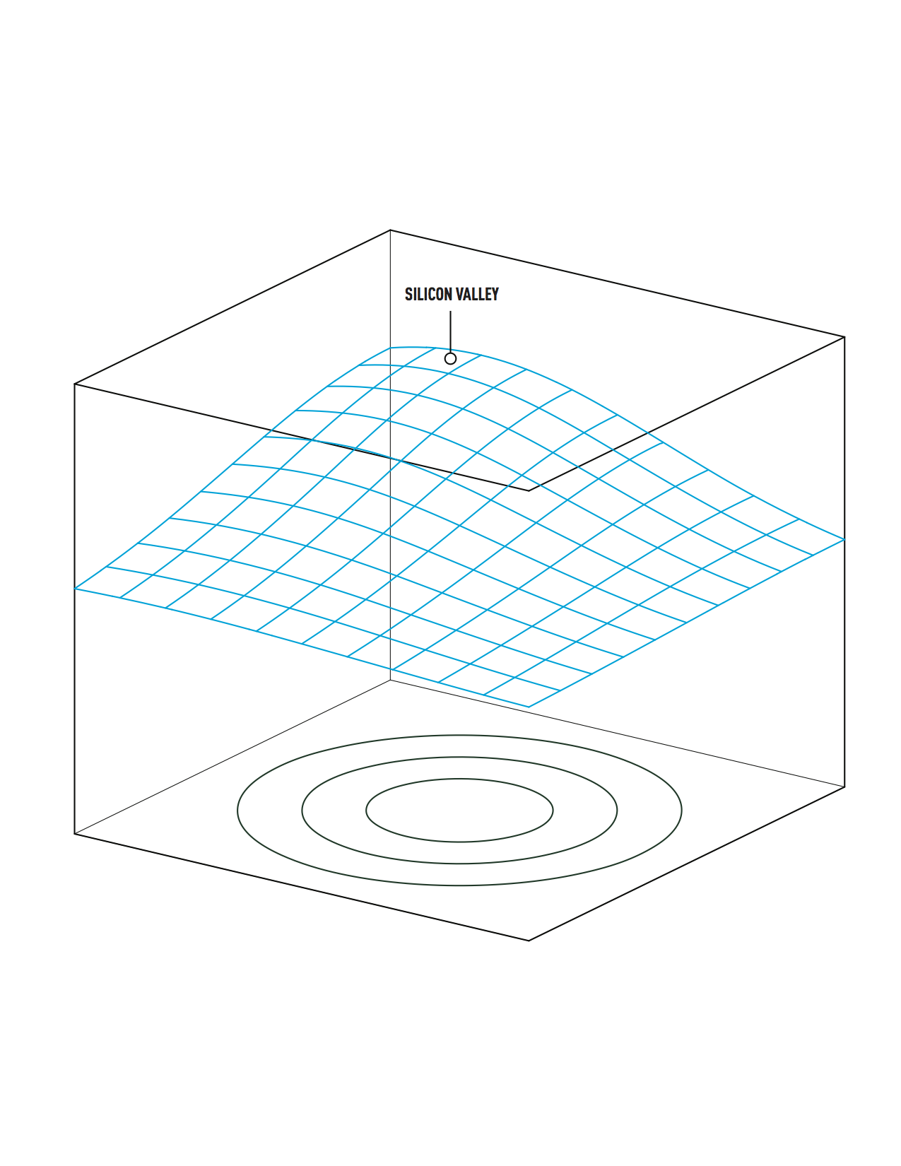 fig. b: The Unevenly Distributed Future Graph represents an interpretation that “the future” is geographically rather than temporally situated, existing in and about Silicon Valley in the Far West United States. Regions situated further away (as the crow flies) from the center of this geo-future may exist moments, or even months behind and are therefore temporally disenfranchised/ disabled from leasing the newest cloud- based services, installing the latest apps, participating in the coolest betas, joining companies before the series C or even mezzanine financing round, purchasing the handiest networked objects, eating the tastiest generipped produce, scanning the latest news updates, etc. In some cases, the geographically furthest regions may never experience the future either because of bad licensing agreements or the political, social or cultural hubris of the Silicon Valley Keiretsu.