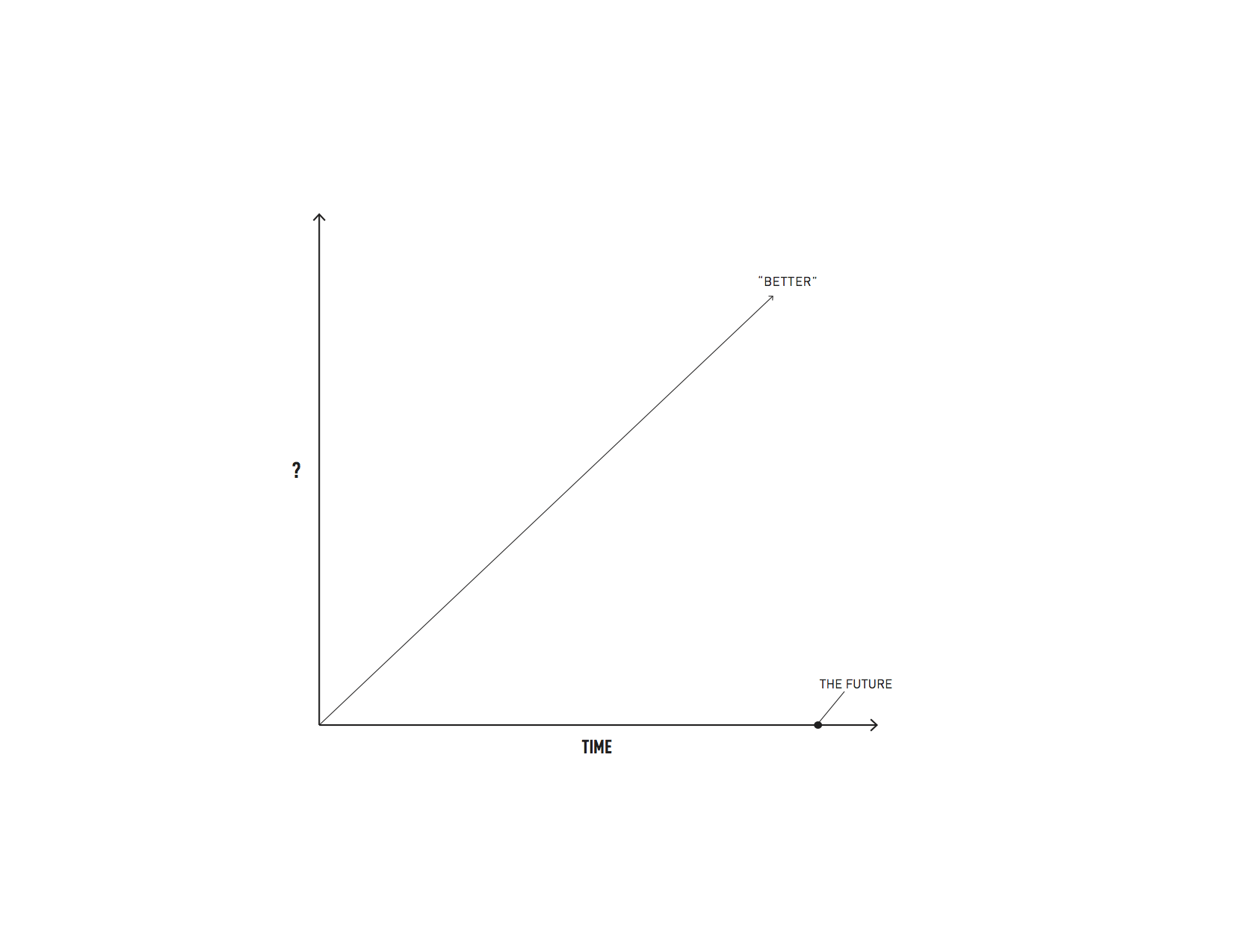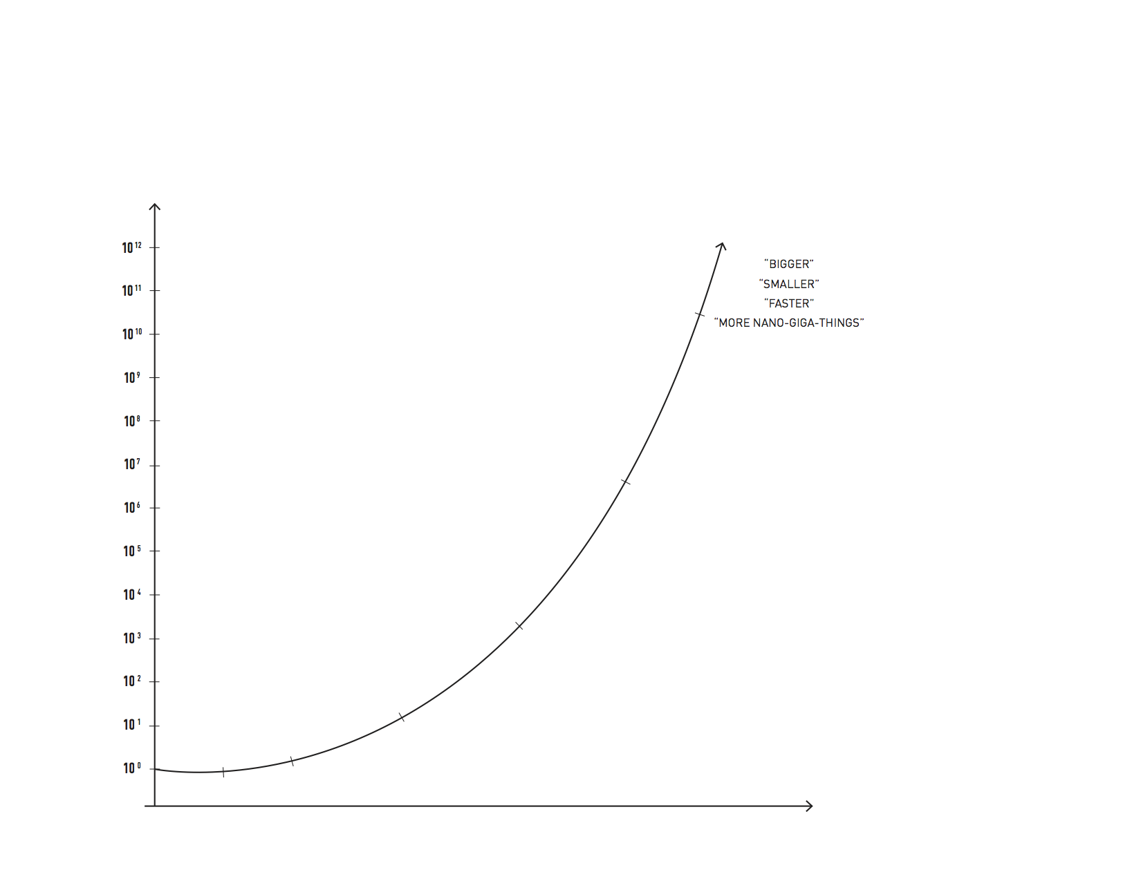 fig. e: Canonical “up and to the right” graph that represents anything today as only getting more-so over time, eg more pixels, faster network, robustity, eco-systemic, lighter/heavier, bigger/smaller, faster/more-thoughtful. Variant of the “Moore’s Law” exponential growth for more modest speculations.